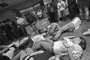 The recruiters stood watch during the action and did not talk with any of the protesters. In an interview after the die-in, Lt. Serge Abergel spoke politely of the protesters but defended his presence at the career fair.